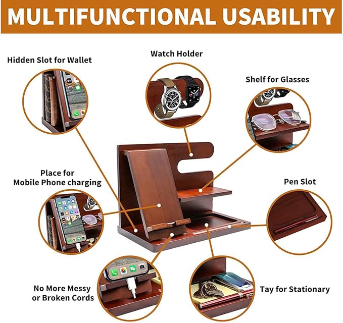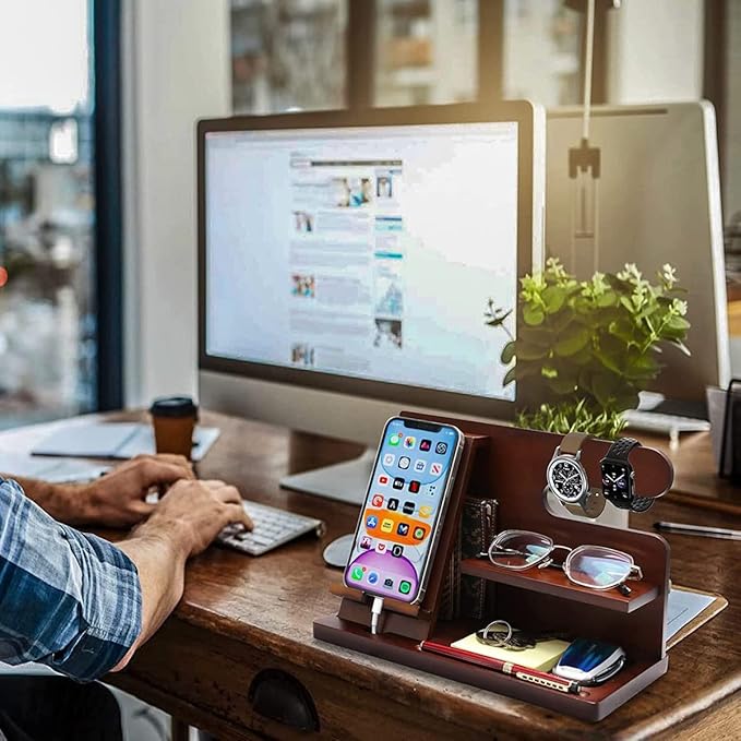 Bamboo Desk Organizer and Storage, Vintage Wooden Phone Docking Station, Durable Wallet Stand Watch Organizer, Beige